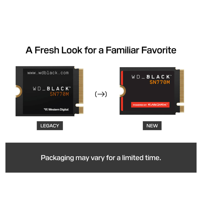 WD Black SN770M (WDS100T3X0G) je 1 TB NVMe SSD u kompaktnom M.2 2230 formatu s PCIe Gen4×4 sučeljem. Postiže sekvencijalne brzine čitanja do 5150 MB/s i brzine pisanja do 4900 MB/s. Koristi 112-slojnu 3D TLC NAND memoriju i arhitekturu bez predmemorije s WD-ovim vlastitim Polaris MP16+ kontrolerom i nCache 4.0 tehnologijom. Pogon je optimiziran za igranje i prijenosnu upotrebu, kompatibilan je sa sustavima Windows, Linux i MacOS te ga podržava WD SSD Dashboard.