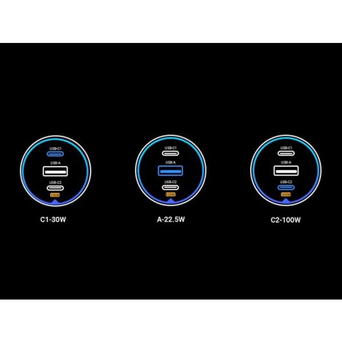 Dvostruki izlaz: C1+C2: 30W+100W, C1+A: ukupno 5V4,8A, C2+A: 100W+22,5W