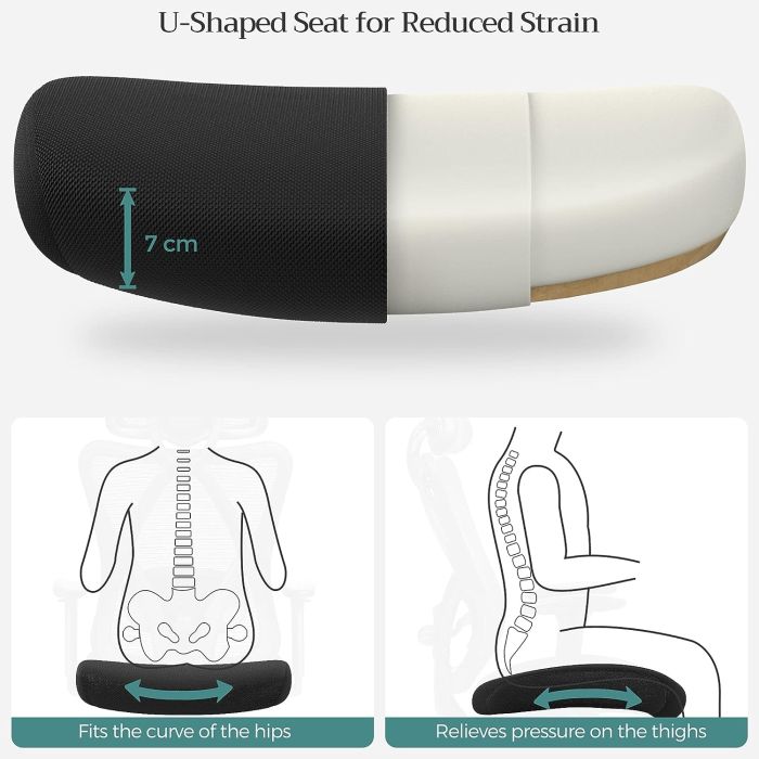 Ergonomski jastuk : Ova uredska stolica opremljena je visoko elastičnim jastukom u obliku slova U koji pruža udobno sjedenje za vaša bedra i bokove. Osim toga, prozračni mrežasti naslon i naslon za glavu olakšavaju dulje sjedenje.