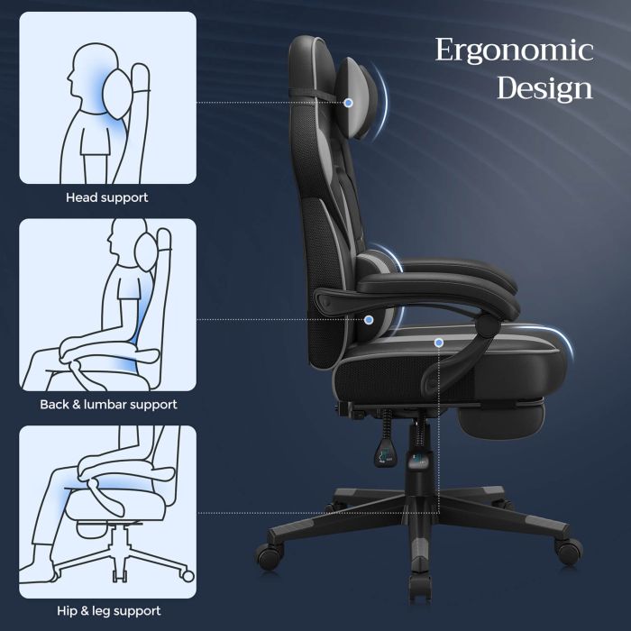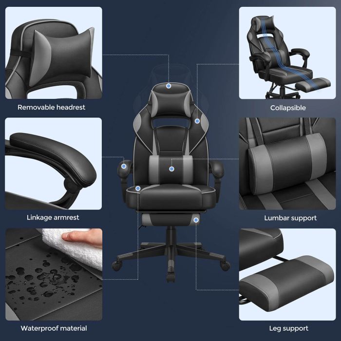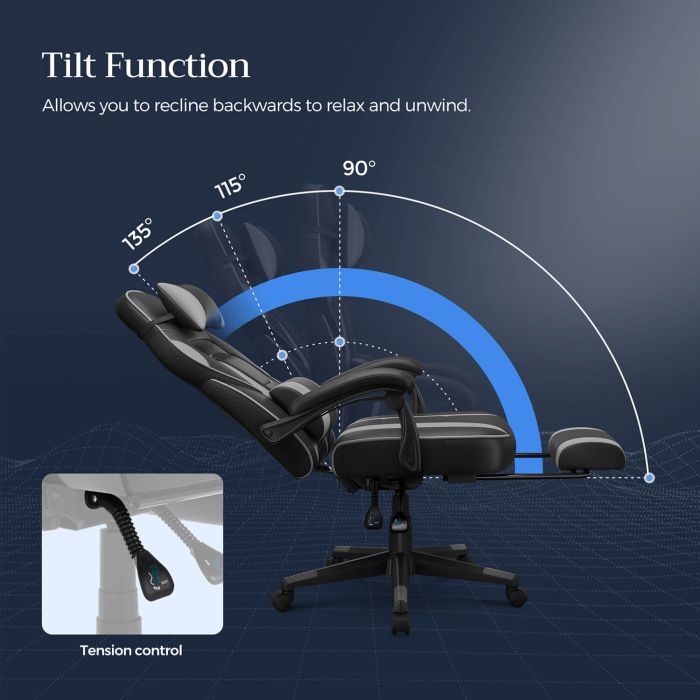 Beskrajna udobnost : Ova gamerska stolica s podesivim naslonom ima lumbalni jastuk, oslonac za noge, naslon za glavu i tihe kotačiće kako bi se vaše tijelo moglo opustiti.